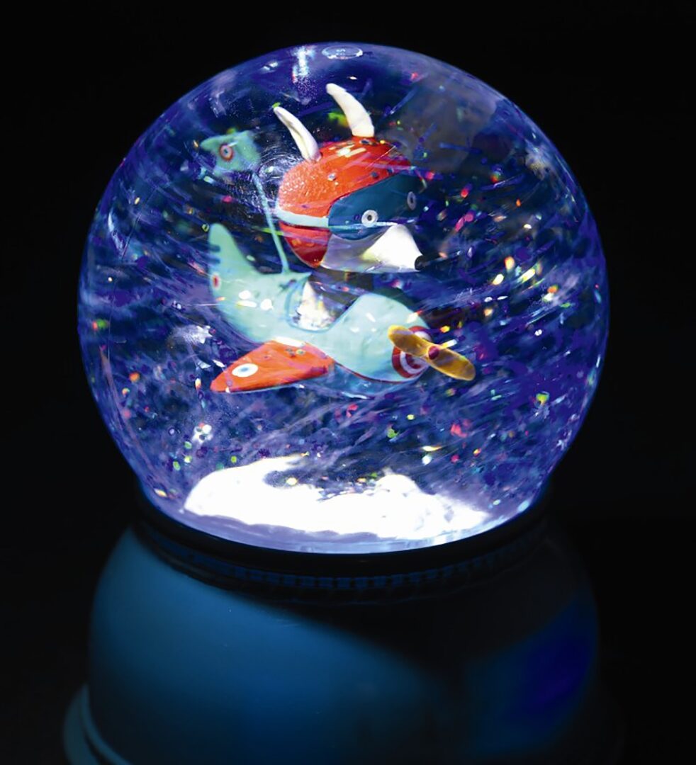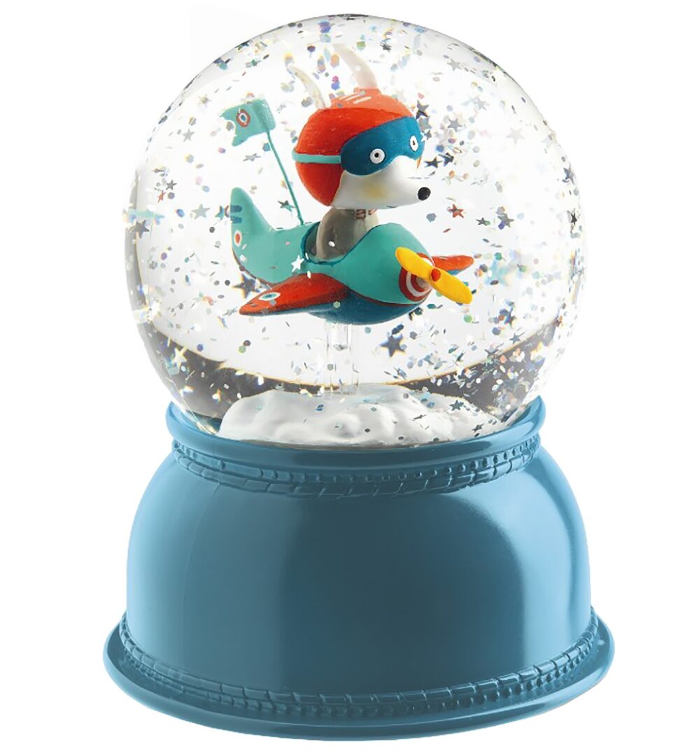 Prekrasna Djeco snježna kugla s bazom u mint zelenoj boji, a unutar staklene kugle nalazi se pas koji leti u avionu u nijansama plave.