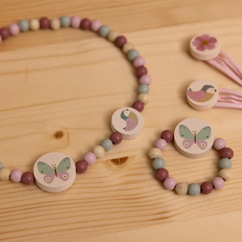 Upotpunite svoj izgled dana ovim slatkim kompletom drvenog nakita. Set je inspirisan nježnim pastelnim nijansama i prekrasnim ilustracijama kolekcije Flowers & Butterflies. Sa ogrlicom, narukvicom i dvije šnale za kosu izgledat ćete tako lijepo! Kombinirajte sa muzičkom kutijom za nakit kako biste pohranili set sa stilom.
