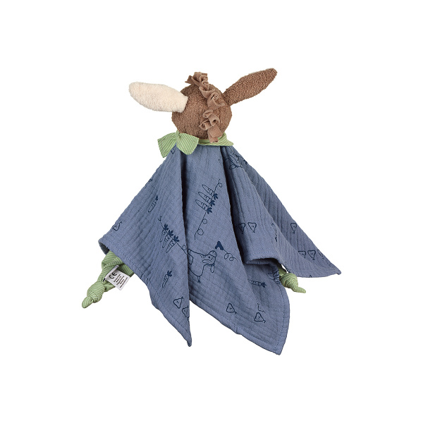 Veseli, umiljati mekani udobni magarac Emmilius harmonično je usklađen u materijalnoj mješavini plave, svijetlog muslina, polipamuka i dresa.