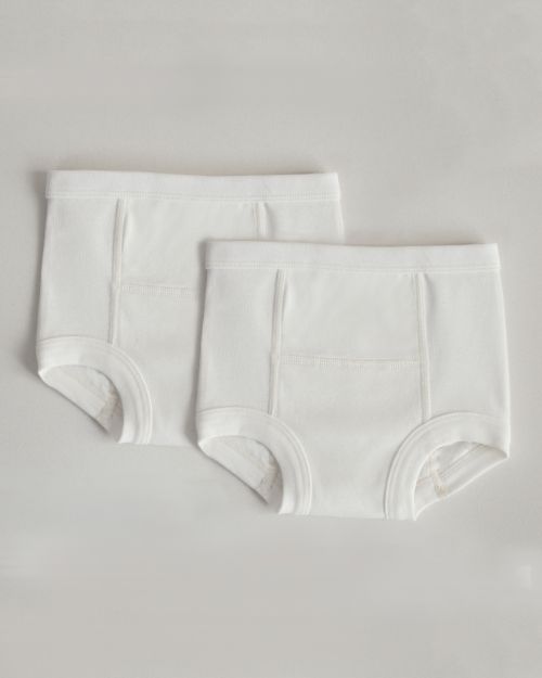 Pakovanje od dva para gaćica od finog rebrastog pamuka, dubokog kroja sa elastičnim pojasem, porubima i ojačanjem na prednjoj strani.