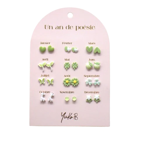 12 pari štapićastih naušnica od keramike i nehrđajućeg čelika uključujući jedan par za svaki mjesec u godini.